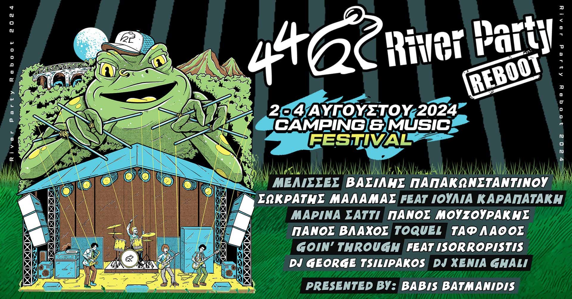 Μαγικές διακοπές και κατασκήνωση δίπλα στο ποτάμι με ζωντανή μουσική, κέφι, και ατελείωτο χορό μέχρι τις πρωινές ώρες. Σας περιμένουμε και φέτος, στην 44η (!!) έκδοση του River Party, για να δημιουργήσουμε αναμνήσεις και να γράψουμε ιστορία. Το line-up μας φέτος είναι με διαφορά το καλύτερο που έχει γίνει ποτέ: