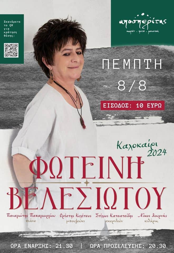 Στην εκδήλωση αυτή, θα έχετε την ευκαιρία να απολαύσετε την αυθεντική ατμόσφαιρα των ρεμπέτικων και λαϊκών τραγουδιών, ερμηνευμένα με πάθος και συναίσθημα από τη Φωτεινή Βελεσιώτου και την εξαιρετική της ορχήστρα. Η ιδιαίτερη χροιά της φωνής της και η μοναδική της σκηνική παρουσία εγγυώνται μια βραδιά γεμάτη νοσταλγία και μελωδίες που θα σας μείνουν αξέχαστες.